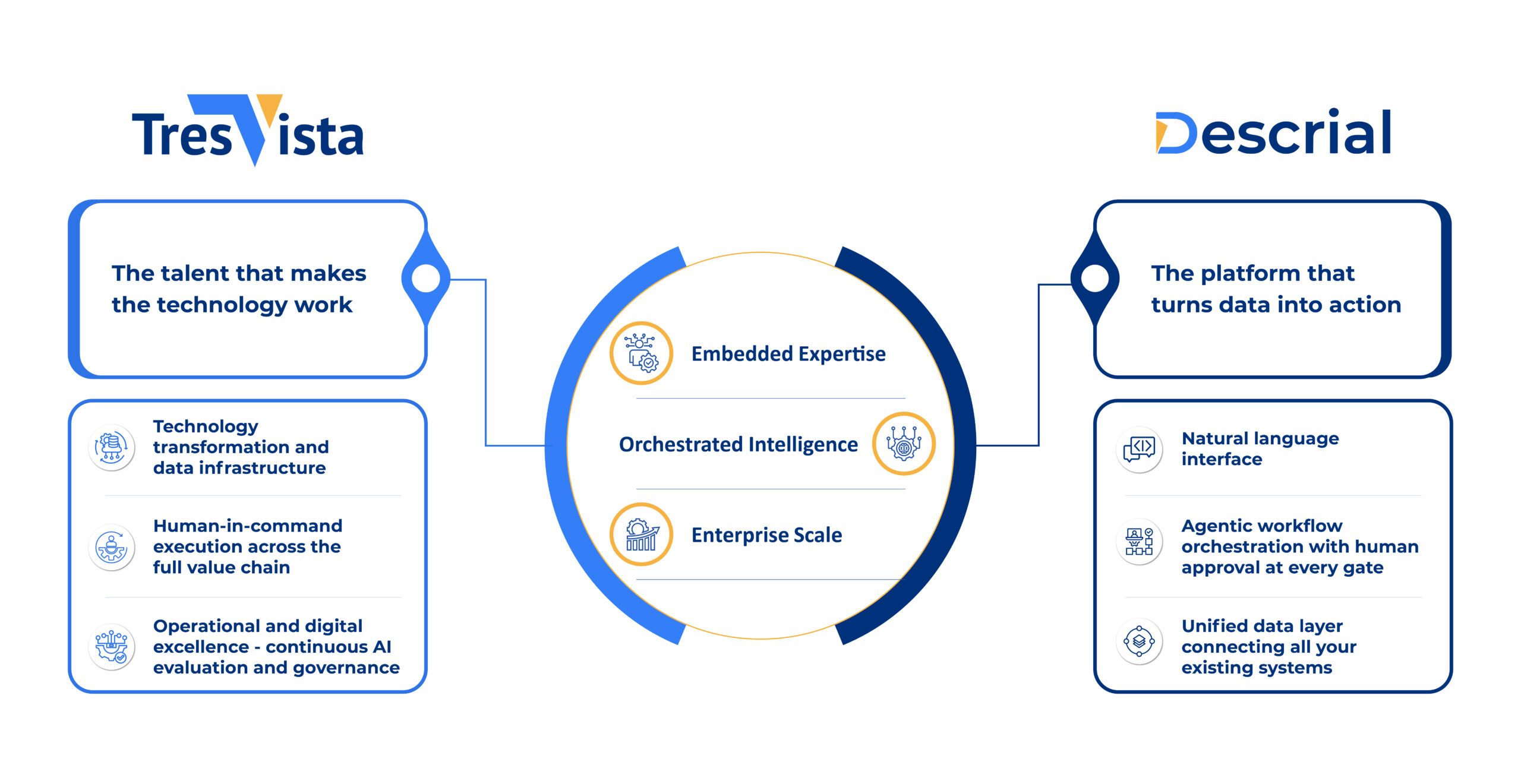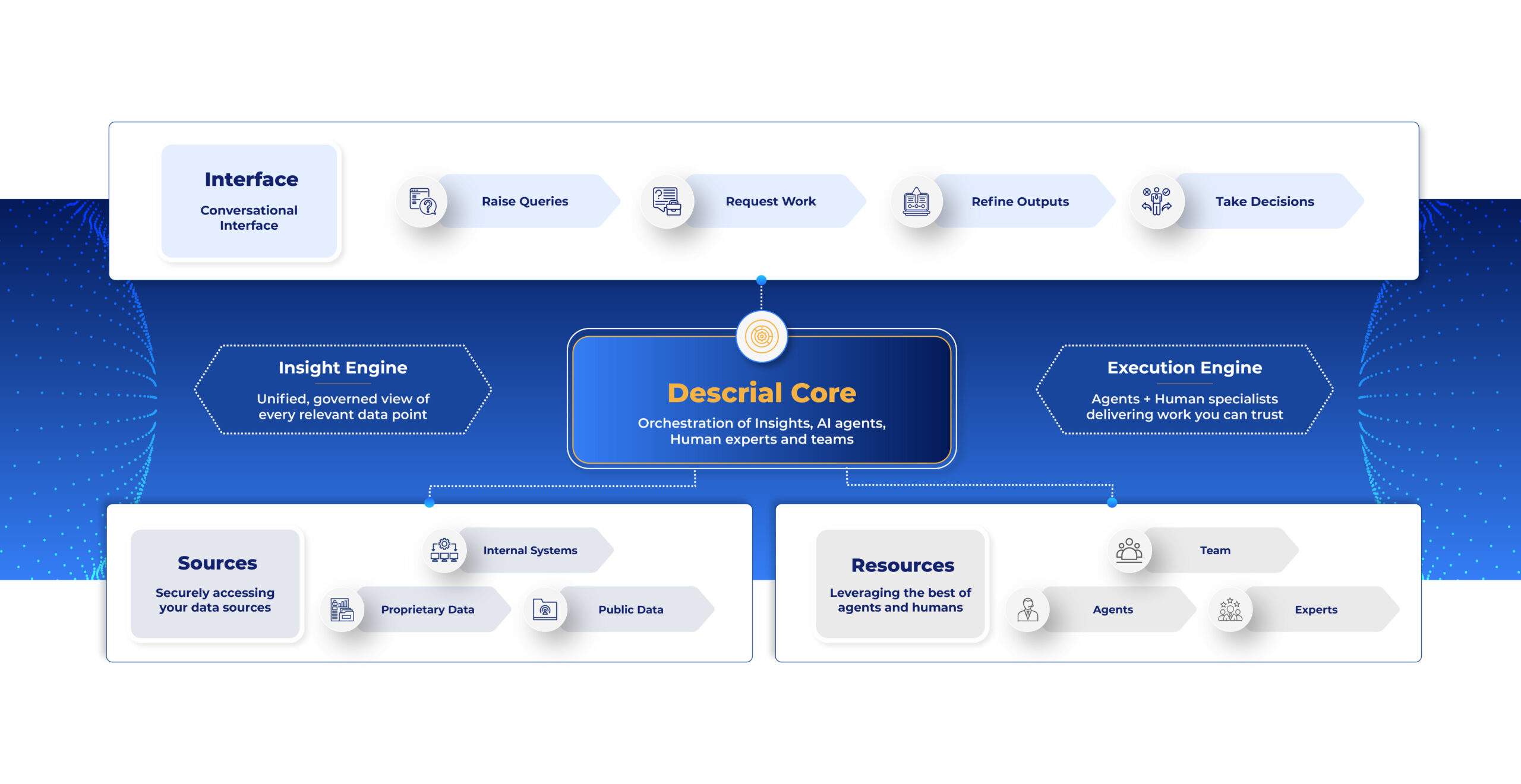 On the other, DESCRIAL, our Technology Platform, provides the Intelligent Operating Environment. It connects disparate data sources and orchestrates complex workflows, offering your teams a powerful natural language interface to access insights.